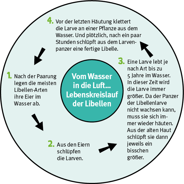 Es gibt viele verschiedene Libellenarten in Deutschland, insgesamt etwa 80 Arten! Die vier Arten, die auf der Infotafel abgebildet sind, kann man sehr häufig sehen. Kannst Du eine der Arten entdecken? Libellen kannst Du gut beobachten, wenn sie über das Wasser fliegen und jagen. Aber wusstest Du auch, dass Libellen die meiste Zeit ihres Lebens als Larve im Wasser verbringen?