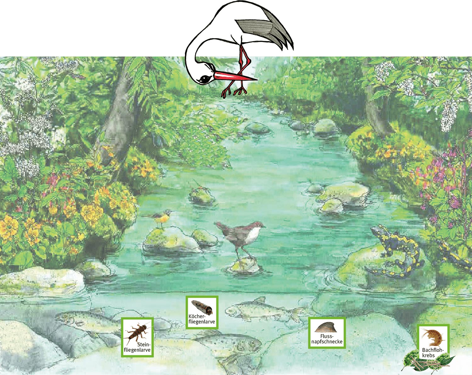 In einem Bach gibt es viele sehr kleine Lebewesen, die man auf den ersten Blick gar nicht wahrnimmt. Sie leben unter Steinen, im Sand oder zwischen Holzstücken und Blättern, die in den Bach gefallen sind. Hier am Stockäckergraben kannst du auf Erkundungstour gehen. Vielleicht hast Du ja Glück und entdeckst unter einem Stein oder zwischen Pflanzen einen kleinen Bachbewohner.